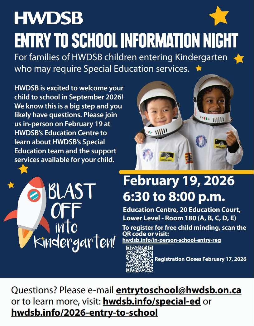 HWDSB provides programs and services to support the learning outcomes for all students. We believe that all children can reach their full potential given sufficient time, support and instruction that meets their specific learning needs and strengths. Please see supports offered at HWDSB.