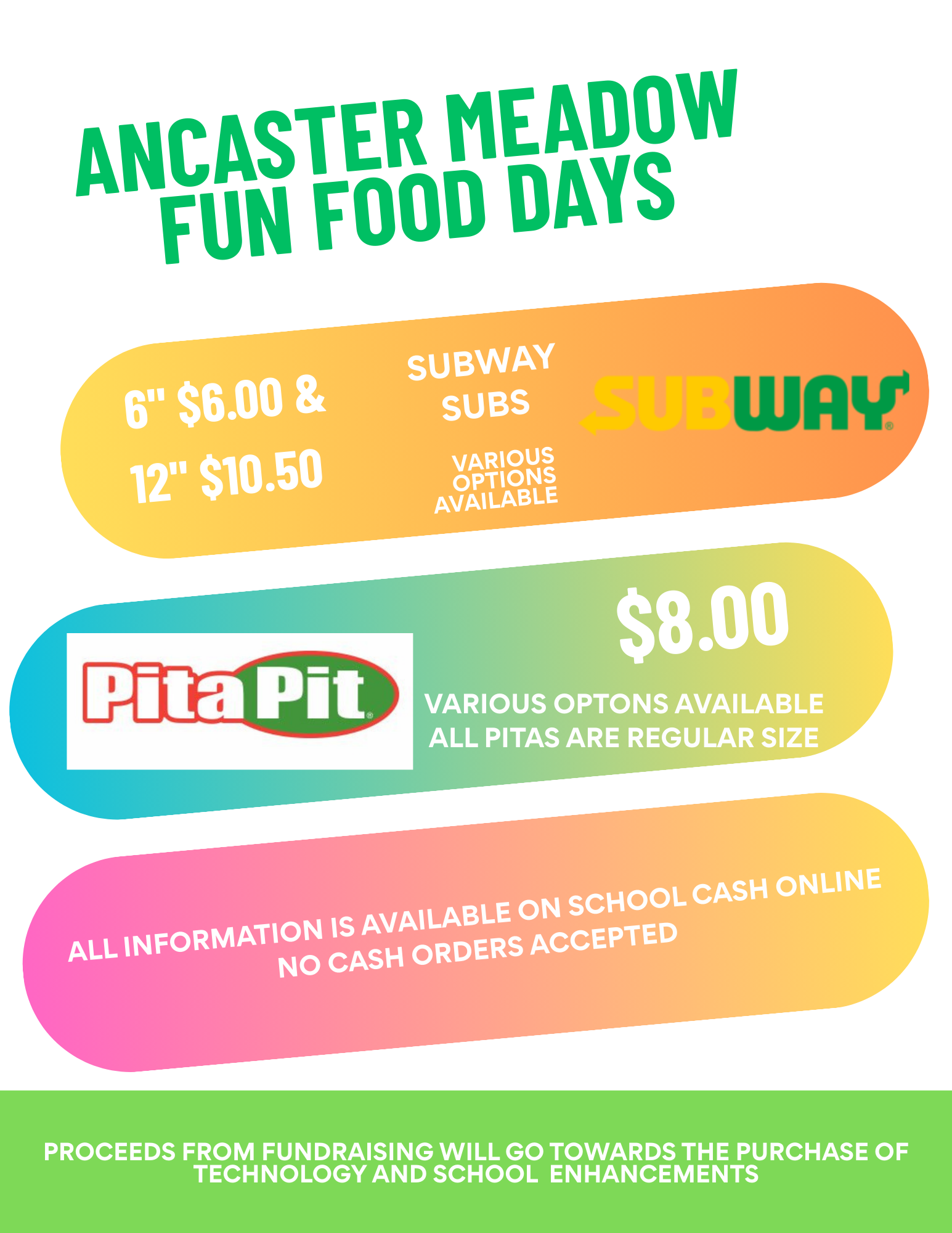 Ancaster Meadow is happy to announce our Fun Food Days happening monthly from December until June. These are optional food days offered to families through School Cash Online. No cash or late orders accepted. We are offering Subway and Pita Pit.