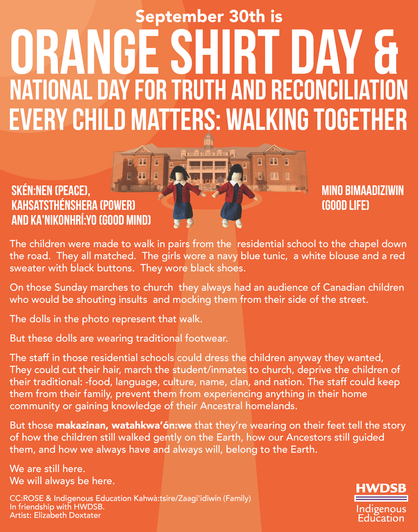 - Orange Shirt Day resource created by HWDSB’s Indigenous Education Team, which has more details including a video from Sherlene Bomberry, a Residential School Survivor.