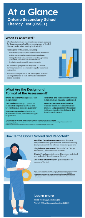 The Ontario Secondary School Literacy Test (OSSLT) measures whether students are meeting the minimum standard for literacy across all subjects up to the end of Grade 9. Successful completion of the literacy test is one of the requirements to earn an Ontario Secondary School Diploma. This year, grade 1o students will write the OSSLT in their English class; that is, any grade 10 students taking ENG2D, ENG2P, or ENG2L this semester will write the test on November 18 and 19, 2025.