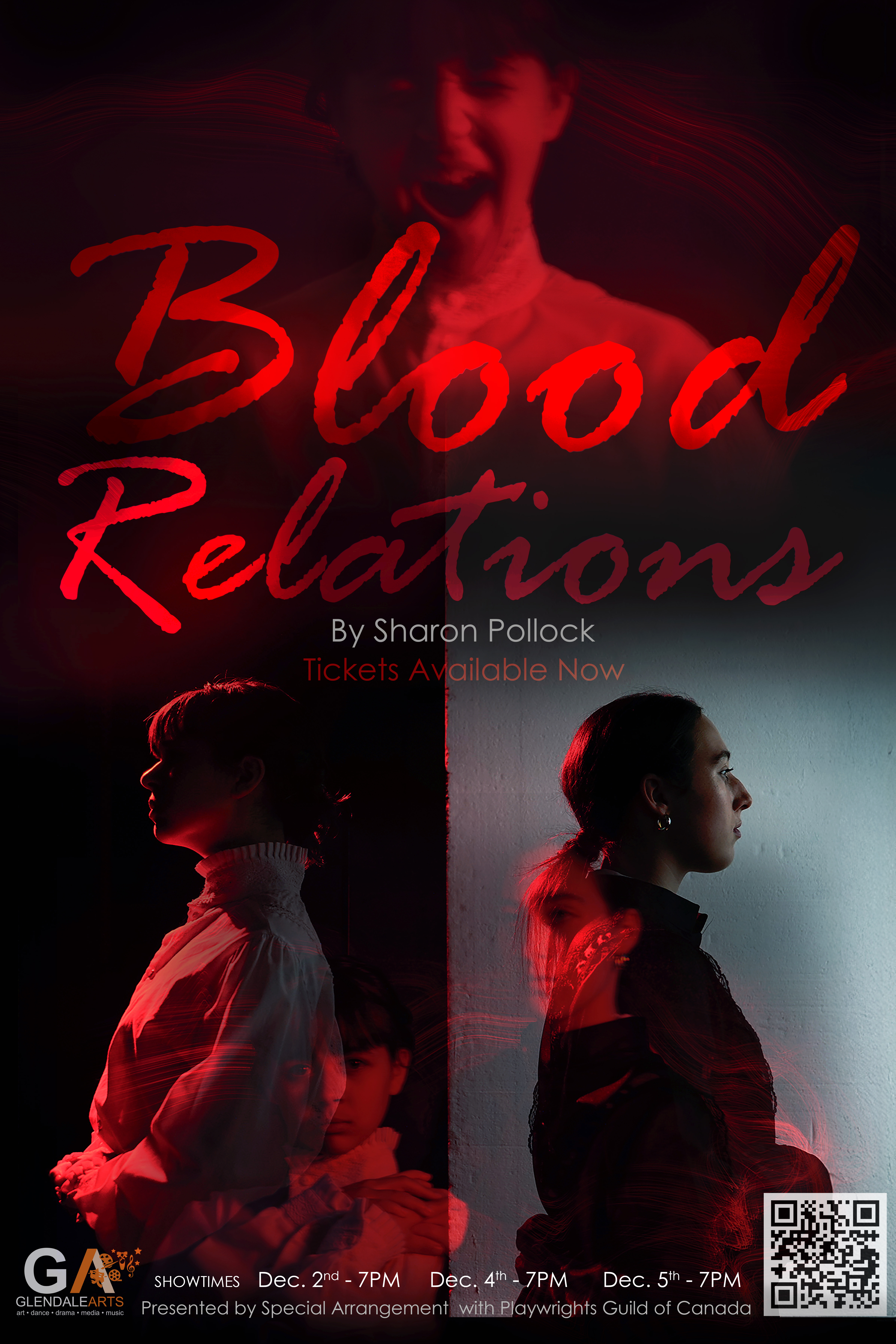 Glendale Arts Senior Drama presents Blood Relations, Sharon Pollock’s award-winning psychological mystery that revisits the infamous Lizzie Borden murders of 1892. Ten years after her acquittal, the real Lizzie and her friend, the Actress, play a “game” of memory and imagination to explore the events leading up to that grisly day. This fascinating and theatrical twist on a historical whodunit delves into themes of identity, truth, and the desperation that can drive an individual to a horrific act of violence. The play challenges the audience to confront their own prejudices and ponder the chilling question: “Did you, Lizzie? Lizzie, did you?”.