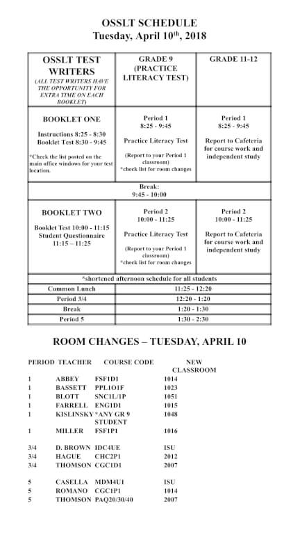 School Day Schedule and Information for OSSLT day – Tuesday, April 10, 2018