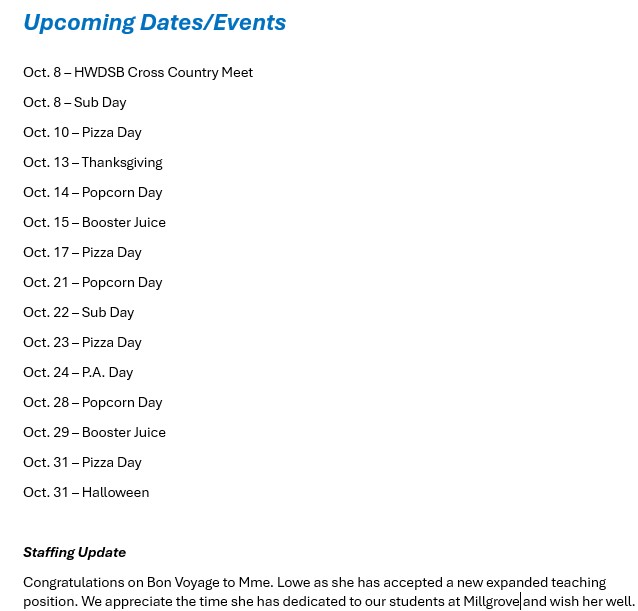 Millgrove Updates – Oct. 3rd