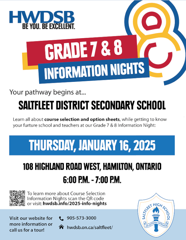 Grade 8 students & parents/guardians are welcomed back to Saltfleet for our Information night on Grade 9 course selection.
