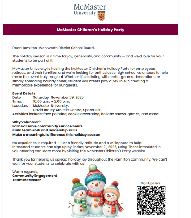 Looking for a volunteer opportunity! McMaster Children’s Party information below (November) – sign up!