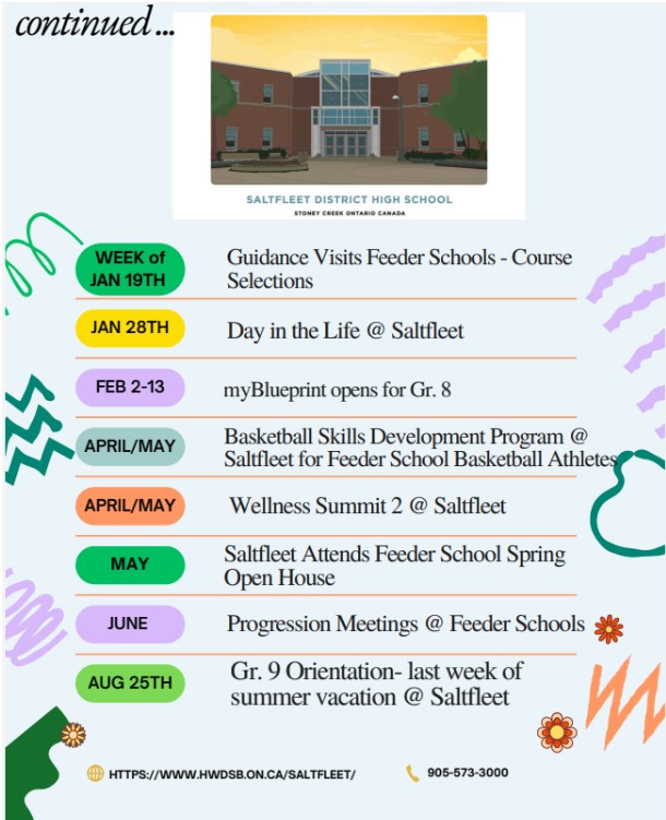 If your child is enrolled in a non-feeder elementary school, and you are moving in our catchment area and wish to attend Saltfleet, please complete “Student Registration Form,”  “Grade 9 Option Selection Worksheet 2025,” and contact Student Services to review the registration process.  905-573-3000 X4388.