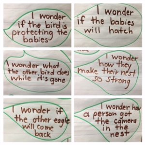The Kindergarten students in Mrs. Koegler’s and Mrs. Grundy’s class have been observing two eagles and their eggs in Washington DC, through a live web cam. Initially the children were asked to just quietly look for a few minutes and then share what they saw with the class. They noticed so many things! Next they were asked to share their thinking based on what they saw using the words. “I think….because…..Then they were asked what they were wondering about the eagles and nest. This routine was done to make the childrens’ thinking visible.